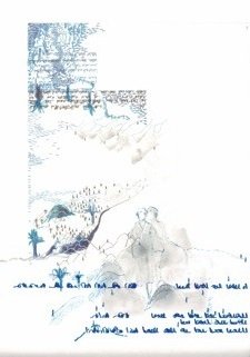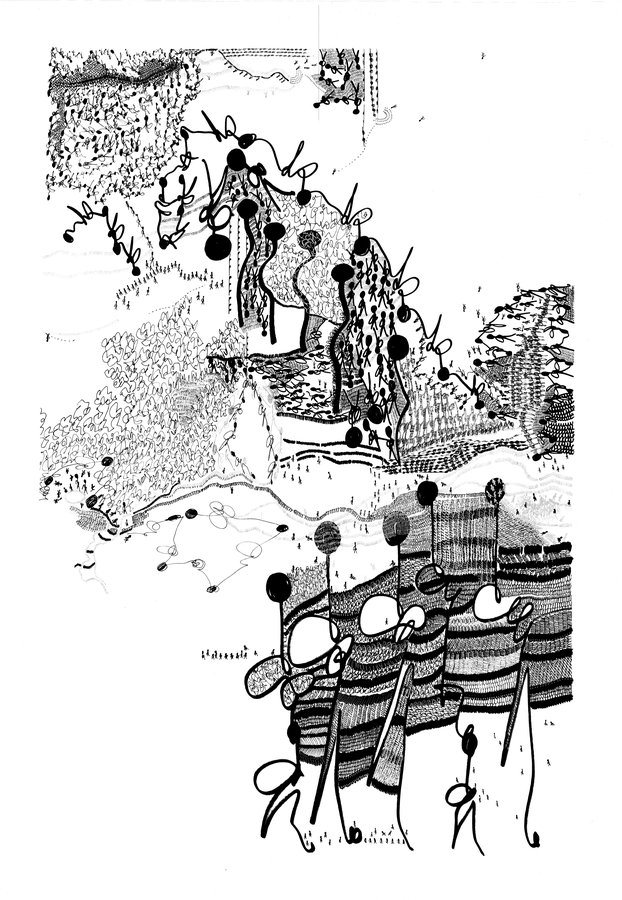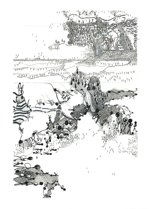Vraies et fausses coutures se mêlent aux graphies. Les vides suggèrent des territoires sur lesquels se déploie une cartographie de mouvements humains avec des personnages en transit.