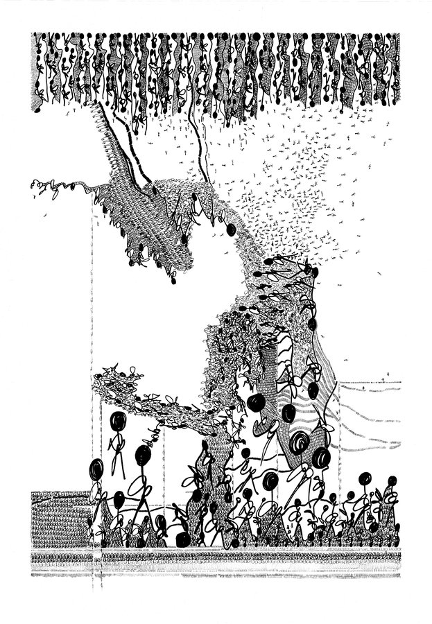 Christine Vanhaverbeke aime que les frontières restent poreuses : notre regard passe indéfiniment du détail à l’ensemble. De loin, nous pensons voir une écriture cursive mais, en s’approchant, on voit se dessiner des silhouettes humaines élémentaires, comme autant de petits personnages en mouvement.