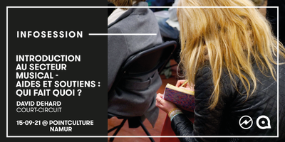 le 15/09/2021 à 15h00PointCulture Namur Infosession | Introduction au secteur musical, aides et soutiens : qui fait quoi ?Infosession | Introduction au secteur musical, aides et soutiens : qui fait quoi ?