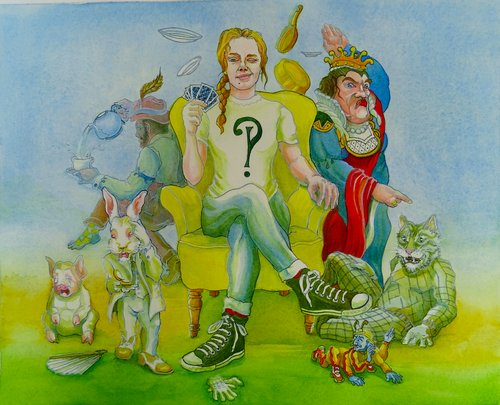 « Quelques aventures d’Alice au pays des merveilles a vu le jour durant la pandémie Covid 2020 - 2021 dont les confinements obligés ont permis la patiente élaboration. J’avais entrepris, quelques semaines avant le début du premier enfermement en février 2020, l’élaboration d’un projet musical sur le chat avec le trio de clarinettes Les Greffiers Nickelés. Le matou d’Alice me semblant incontournable et surtout inspirant. Les premières notes furent jetées avec enthousiasme. Rapidement, et puisque le temps, notion si chère à Lewis Carroll, m’était offert sur un plateau, l’envie d’une adaptation musicale et contée des aventures d’Alice se fit impérieuse. Les signes étaient forts : ma fille s’appelle Alice et fêtait ses trente ans en 2021. Dans la foulée, vint l’idée des illustrations, la peinture étant mon violon d’Ingres. Ainsi donc prit forme entre février 2020 et juillet 2021 ce projet fou qui, sans les conséquences indirectes de la Covid, n’aurait peut-être jamais vu le jour. La tâche semblait ambitieuse et c’est non pas à coup de tasses de thé mais de moult expresso que je pris la route de ce périple extravagant. J’ai dû faire des choix pour une version d’environ une heure. Adapter, colorer une traduction conforme au format de mon projet. La souplesse et la mobilité d’une formation de poche comme la nôtre (une petite clarinette, une clarinette, une clarinette basse, un conteur ,une conteuse) me semblait opportune en ces temps incertains pour les choses de la culture. Dix planches à l’aquarelle sous forme d’images vitrail illustrent les dix tableaux musicaux contés sans interruption. La première place est au texte (qui se décline en différents modes : narration, monologue, dialogue, Rap, parlé-chanté) auquel la musique est entièrement dévouée. J’ai voulu une double lecture musicale à la fois simple et travaillée sur l’image. Un peu comme la double lecture possible du texte de Lewis Carroll. J’ai opté pour un thème dévolu à chaque personnage principal et des motifs récurrents pour certains évènements (le temps , les transformations d’Alice par exemple). La notion de temps hors du temps a été un moteur d’inspiration pour les illustration. En témoignent les effets de perspectives superposées, les personnages aux costumes d’époques et de styles divers et variés. Et surtout, j’ai décliné une Alice aux portes de l’adolescence, moderne, arborant sur son t-shirt un logo mêlant le point d’interrogation et le point d’exclamation, deux symboles de l’œuvre selon moi. Enfin, j’espère avoir rendu modestement, un peu de l’écho de ce délire onirique foisonnant et génialement absurde que nous offre à chaque page Lewis Carroll. » Philippe Leloup