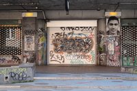 Le fond de la photographie est un mur noir dans l’obscurité de la nuit sur lequel sont peints les contours lumineux de la lettre « V ». Par terre contre le mur reposent quelques vagues objets, dont un sac en plastique. Entre le « V » et le sachet, on devine un rayon de lumière jaunâtre, quasi transparent. En observant de plus près on comprend qu’il s’agit d’une personne debout. On distingue ses jambes couvertes jusqu’aux genoux par un short et des baskets aux pieds. Cette présence spectrale, sans doute l’auteur du « V », première lettre d’un mot qui suivra à l’aide d’un spray can invisible dans l’obscurité. La technique de la longue exposition permet de rendre perceptibles des couleurs et de la clarté invisibles à l’œil nu dans ces conditions. Il s’agit ici d’une manière subjective de percevoir la vie urbaine nocturne par Martin Soumagne