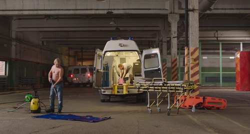 Le film enchaîne sur une scène de voiture : le même Oleg, cette fois sur la route avec sa femme Katya (Irina Gorbatcheva). Déjà passablement éméché à son arrivée dans sa belle-famille (le litre de mauvais vin ingurgité sur l’autoroute), le jeune médecin transformera l’anniversaire de son beau-père en orgie de vodka, sous le regard appuyé et insondable de Katya. Ces deux-là se sont rencontrés à la fac de médecine. Dans quelques années, elle sera chirurgienne, comme son père. En tant qu’urgentiste, lui se sent méprisé, ravalé dans l’organigramme de l’hôpital au statut de simple collecteur de patients. Le film le suit caméra à l’épaule au fil de ses stressantes interventions : l’occasion d’autant de coups d’œil indiscrets à la vie de ces Russes de province (le film a été tourné à Yaroslavl, à 250 km de Moscou), dont l’aménagement des appartements dit beaucoup.