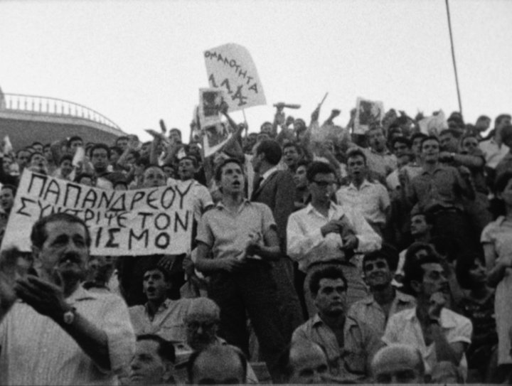 Dans deux films repris au sein du coffret, De la Grèce [Von Griechenland] (1965, 27’) et Être tzigane [Zigeuner sein] (1970, 47’), l’image est le champ du présent, tandis que la voix off est – en grande partie – le champ du passé. Et les deux films jouent de cette juxtaposition, de cette tension, de ces allers-retours entre passé et présent, entre l’histoire qui peut déjà être racontée et celle qui n’a pas encore ce statut et n’est encore qu’en train d’être filmée. Dans le premier film – où les deux récits finissent par converger vers le synchronisme –, c’est la résistance grecque contre le fascisme et le nazisme pendant la guerre 1939-1945 et contre les forces réactionnaires ensuite qui est mise en relation avec les manifestations de gauche de l’été 1965, l’assassinat par la police et les funérailles par ses partisans du leader étudiant Sotiris Petroulas.
