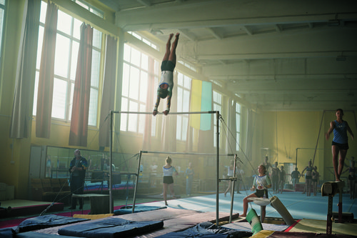 Bien que le volte-face soit ce qui prédomine dans le caractère de l’adolescente, le dispositif laisse parler les différents espaces qui, d’une certaine manière, influent sur sa condition. Entre l’Ukraine et la Suisse, Maïdan et le centre sportif de Macolin dans le canton de Berne, entre la modernité tapageuse de certains quartiers de la ville de Kiev et l’immuable souveraineté de la montagne sous la neige, entre les muscles, enfin, et la volonté, ce sont moins des effets de contrastes qu'un rappel obstiné de ce qui limite le corps. La liberté de la gymnaste s'identifie au mouvement : Olga entend là l’urgence de retraverser la frontière. Existe-t-il terrain plus favorable à la culpabilité et la détresse que celui de l’exil ?