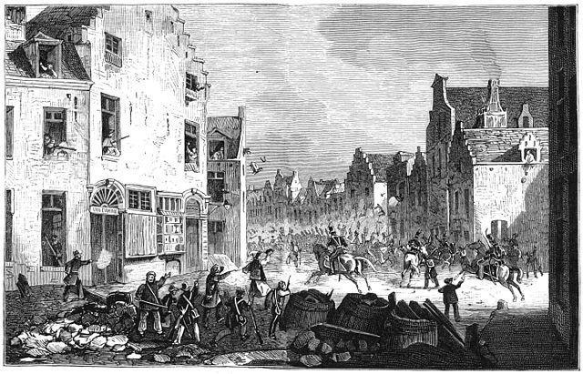 Paris vit sa deuxième révolution en juillet 1830, connue sous le nom des Trois Glorieuses. Ces trois jours de combats de rue aboutiront au renversement de Charles X et à l’avènement de Louis-Philippe, « roi des Français par la volonté nationale ». Rien de tel pour échauffer les esprits de leurs voisins belges, déjà animés d’une sourde colère à l’encontre de leur souverain. Depuis quelques semaines, on voit germer graffitis et tracts, et des lectures publiques de journaux français se multiplient aux coins des rues. À La Monnaie, La Muette de Portici, d'abord interdite, est finalement autorisée à l'occasion des célébrations d'anniversaire de Guillaume Ier, le 25 août. Les spectateurs, électrisés par la représentation, sortirent en clamant « Vive la liberté », « Aux armes » ou encore « Au National », organe de presse gouvernemental, qui sera saccagé en premier. De nombreuses habitations de notables, commissariats et bâtiments orangistes seront aussi la cible des insurgés, et quelques armureries et magasins de jouets (pour y voler des tambours !) seront pillés. On compte une vingtaine de morts parmi les manifestants au Grand Sablon. La place Royale sera aussi le théâtre de tirs sur les émeutiers. Les affrontements seront maîtrisés par les autorités trois jours plus tard.
