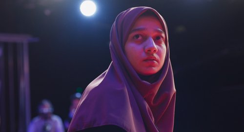 Les deux femmes sont enfin sur scène, interviewées par un présentateur qui reçoit des ordres d’Ayat par l’oreillette. Malgré les émotions qui la submergent, Maryam tente de raconter son histoire, sa vérité, celle d’une jeune femme forcée (par sa mère) à conclure un mariage temporaire avec un homme riche et beaucoup plus âgé qu’elle. Elle avait signé un contrat qui lui interdisait d’avoir un enfant mais elle est tombée enceinte. Elle a eu une altercation avec son mari ; il a été blessé mortellement, et, paniquée, elle a fui (l’histoire n’entre pas dans les détails, Maryam a-t-elle donné le coup fatal ou s’agissait-il de légitime défense ?). Mona reste de marbre mais on sent qu’elle fulmine intérieurement et que la décision n’est pas aussi simple qu’il n’y paraît, pour des raisons très éloignées de la simple question du pardon (et peu honorables comme l’apprendra le déroulement de l’action).