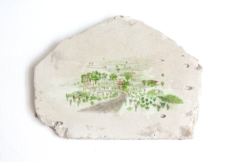 Léa Mayer fixe ça à l’aquarelle, finement, restituant la fragilité des mémoires. Des bulles précieuses prêtes à s’estomper. Enluminées. Sur des fragments de plaques de plâtre. Des supports mobiles comme les vestiges d’une maison virtuelle. À déposer contre les murs, enfouir dans les graviers, entre les herbes. Des images spores qui disséminent les paysages intérieurs des personnes qui se sont racontées. Du coup, la ville devient maison de verre où s’enchevêtrent tous les paysages langues du monde. [PH]