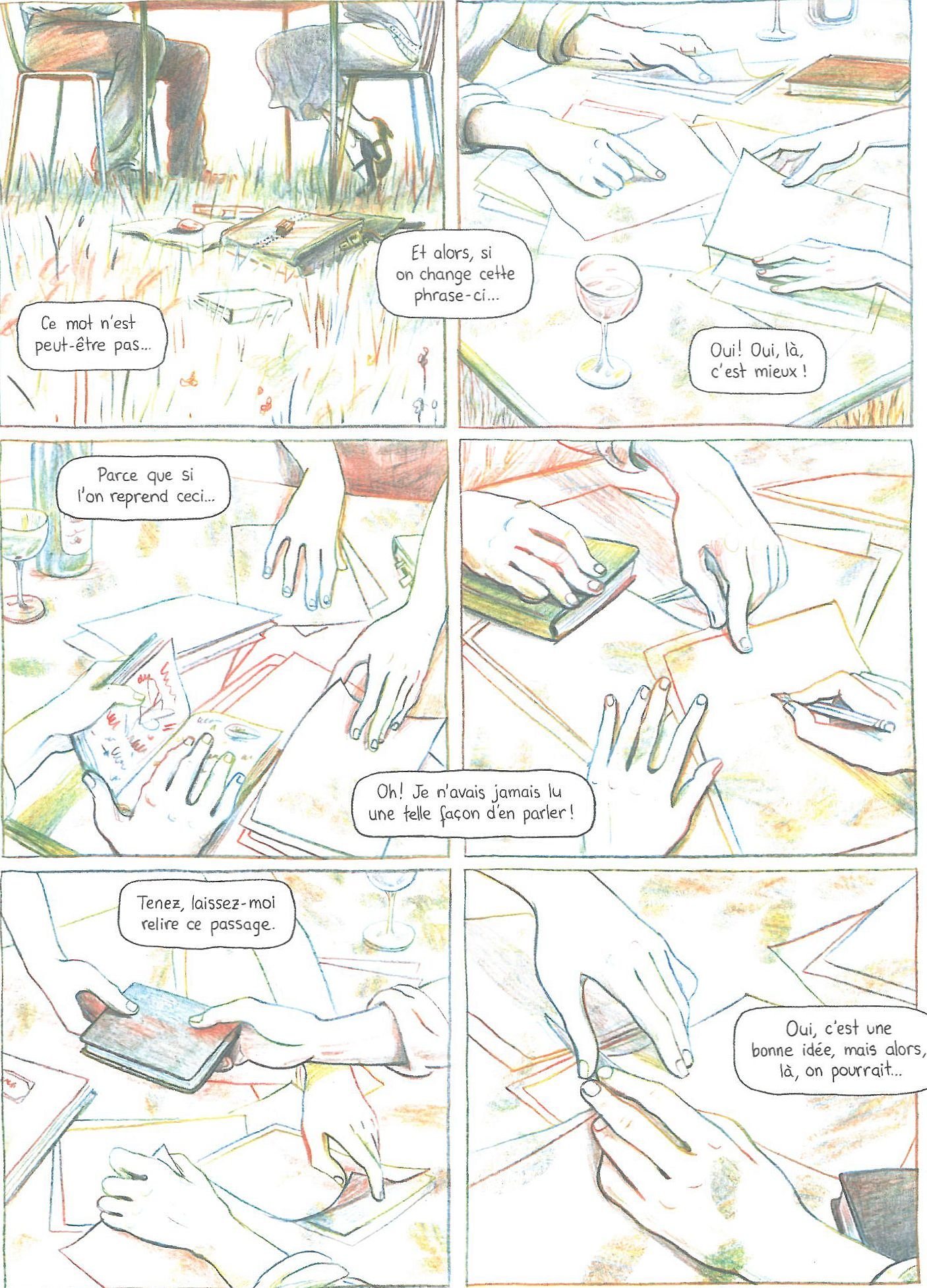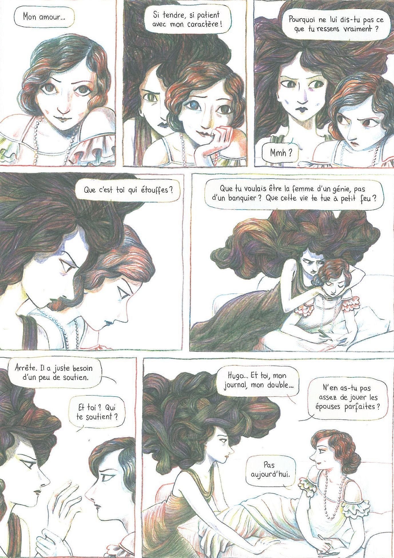 La complexité se résout dans un dessin foisonnant, apte à générer ses propres figures de style. Prenant au mot l’écrivaine qui disait de son journal qu’il était son double, son miroir, son reflet, son âme sœur, la dessinatrice l’exhibe comme un personnage à part entière. Longue chevelure défaite, Anaïs s’apparaît à elle-même dans un dialogue habile et mystificateur. Il serait en effet trop simple de montrer que la voix intérieure l’emporte sur le paraître social, que le désir est sage et la sagesse folie : le mensonge (la fiction) dissout tous les contours du réel. La lucidité réside dans l'énonciation de toutes ces contradictions.
