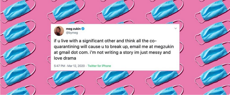 « Si vous vivez avec un être cher et que vous pensez que vivre ensemble la quarantaine va vous conduire à la rupture, écrivez-moi. Je veux pas écrire un livre, j’aime juste le drame ». Meg Zukin a reçu tellement de réponses qu’elle les a recensées sur un site internet. Des histoires quotidiennes, des questionnements, des ruptures, des gens qui s’aiment ou qui s’aimaient.