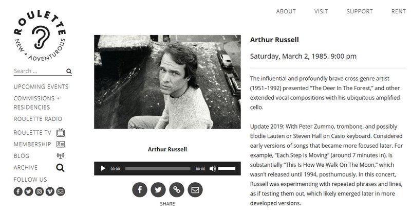 Mais cette période particulière est aussi l’occasion de voir des enregistrements resurgir du passé. Et la musique la plus bouleversante que nous avons écoutée depuis très longtemps est sans conteste l’enregistrement live d’Arthur Russell qui a refait surface récemment sur le site de l’artists’ run space new-yorkais Roulette (pouvant se targuer d’avoir accueilli plus de 4000 concerts et performances depuis 1978).
