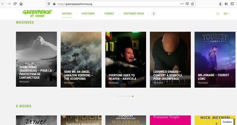 Greenpeace lance un site proposant divers contenus en lien avec les différentes campagnes menées par l’organisation. On y trouve des vidéos traitant du climat, de la mobilité et de la protection des forêts et des océans, des podcasts en tout genre et des pièces musicales offertes à Greenpeace par des gens aussi divers que Ludivico Einaudi, Radiohead, the Scorpions ou le groupe de hard rock indonésien Navicula. Le site associe l’attrait des “belles images” de la nature avec des contenus intéressants et éducatifs, avec des propositions légères et d’autres plus sérieuses comme une interview de Naomi Klein sur la menace d’une exploitation capitaliste de la pandémie. [BD]