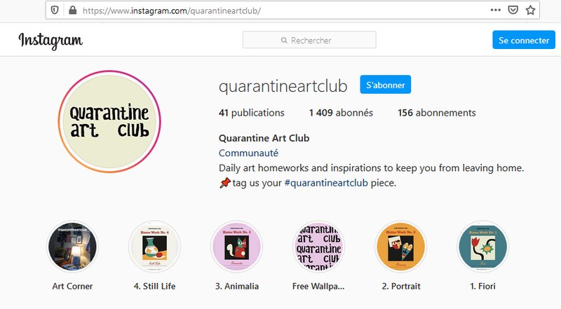 Le Quarantine Art Club se présente comme une communauté qui – sur Instagram – vous propose chaque semaine de réaliser une œuvre d'art autour d'un thème suggéré. Vous pourrez utiliser la technique ou le médium de votre choix : peinture, dessin, photo, sculpture… tout est permis ! Il suffira ensuite de leur envoyer une photo de l’œuvre par message privé ou de les taguer #quarantineartclub pour figurer dans leur sélection.