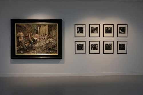 La visite se poursuit en conservant l’intuition comme point de départ, puisqu’elle est instigatrice des images résultant de ce projet expérimental. Ici, bien plus que l’aspect formel, c’est le désir du photographe d’introduire une continuité entre passé et présent qui est mis en évidence. Les travaux présentés empruntent la voie de la mémoire et du souvenir. Cela débouche souvent sur une série d’images dont le récit nouveau dialogue avec l’œuvre du passé. C’est par exemple le cas du travail de Bénédicte Thomas, elle-même exposante, qui se sert d’une peinture de Dany Vienne pour établir un dialogue avec des personnes placées en centre psychiatrique. Comment perçoivent-elles le tableau ? Leur ressenti fait-il écho à celui de l’artiste qui a peint la toile ou à celui de la photographe qui l’a choisi comme point de départ pour son projet ? L’interprétation singulière se meut ainsi en interprétation collective. Le sujet peint par Dany Vienne est prolongé et actualisé par les images de Bénédicte Thomas qui proposent de mettre en scène le sentiment des personnes qu’elle a interrogées.