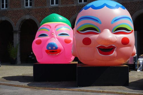 Elles font penser à beaucoup de choses, elles évoquent des fêtes et traditions orientales, des carnavals chinois, mais pas que, tout autant de grandes foires commerciales que des transes techno, kitch, au repos. Elles dialoguent, à travers les murs, avec les collections du musée, les magnifiques masques du monde entier et le centre d’interprétation où palpite la mémoire du carnaval binchois. Elles partagent des fonctions avec ces documents précieux tout en affirmant d’autres formes d’enracinement, plus mobiles, plus errantes, affirmant une sorte de « nouveau folklore », émanant de nouveaux territoires à découvrir, de pays imaginaires et de leurs nouveaux rituels. Baptisées Happy Heads, elles affichent un bonheur inconditionnel, une joie paisible et stable (mais à la manière de tous les masques, qui figent des traits physionomiques pour en recouvrir d’autres). La mélancolie n’est pas ce qui prédomine, mais elle est présente, aura discrète, voire insidieuse. À l’intérieur, une autre de ces têtes hilares trône dans l’obscurité, accompagnée d’une bande-son où défilent, de manière robotique, et en toutes les langues, des paroles de chanson d’amour désincarnées. Voilà ce que ressassent ces grandes figures béates, et ce qui s’en dégage, mêlé à l’exubérance gonflée à l’hélium, un sentiment poignant de solitude sentimentale, subtilement. Cette présence dans la cour crée contrastes et convergences avec le lieu et donne envie de plonger dans ses salles.