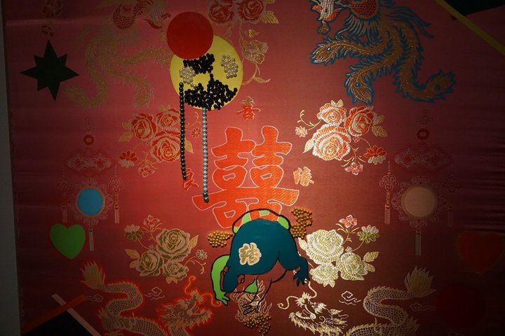 Ils les réalisent souvent à deux et s’influencent constamment. Rajouter du texte, des découpes, des aplats, des éléments narratifs, des tissus, des photos… permet de donner une profondeur visuelle aux œuvres et d’installer des niveaux de lecture différents. Dans leur série de peintures sur d’anciens ou nouveaux tissus chinois, les artistes reviennent à une pratique chinoise que l’on retrouve dans les complexes broderies anciennes. Appliquer des dragons, oiseaux mythologiques, fruits, navets, choux sur un beau tissu chargé de relief ou uni… les Chinois font cela depuis des siècles. — Patricia De Peuter, Guide du visiteur