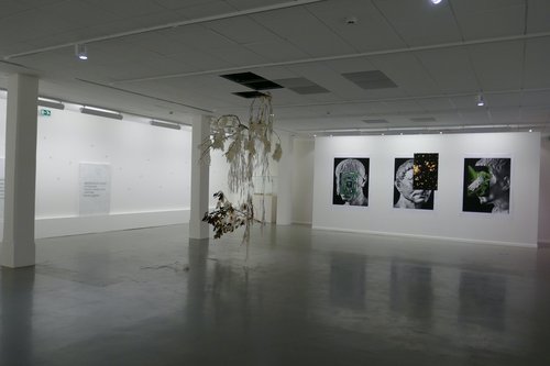 De vastes végétations mutantes cryogénisées pendent du plafond, rameaux chimériques d’immortalité ; écritures presque monochromes, gravées au laser sur cuir blanc, châssis alignés comme les tables de loi de l’être futur augmenté ; un frigo-sarcophage conservant pour les générations à venir trois formes distinctes de grouillements civilisationnels interdépendants et hors service : la forme nue et défoncée d’un crâne, un casque de motard fourré de paille et fils électriques, un nid d’abeilles éventré. Des portraits antiques supplantés par des cartes mémoires suspendues dans le cloud. Un ouvrage de divination, livre de tissus reliés, cosmogonies de taches floues à interpréter sans fin, liturgies digitales pour conjurer ce qui vient. Le dernier mot revenant à un ancien de Fluxus donnant rendez-vous au vernissage d’une exposition à Tokyo, organisée en partenariat avec le Centre de la gravure le 24 août 2947…