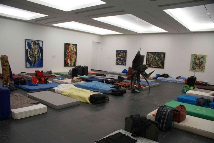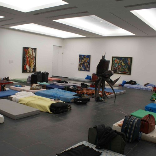 Et puis, on entre dans la partie consacrée à un choix d’œuvres des collections. Elle a été intitulée Verlust der Mitte. « Perte de centre ». C’est le titre d’une œuvre d’Asger Jorn, membre du groupe Cobra, qui lui-même l’avait choisi en référence au livre principal d’un historien d’art ayant appartenu au parti nazi, Hans Sedlmayr, et plus que probablement pour contribuer à dénazifier l’approche de l’historien d’art. La « perte de centre » peut signifier catastrophe pour les uns, progrès pour les autres ! Mais dès le premier pas, c’est autre chose que l’on voit, qui saute aux yeux, qui fait « œuvre d’art » et « musée ». Et qui, plus que n’importe quelle œuvre d’art, fait exploser le centre de la mondialisation. Tout tourne. Les salles sont occupées, elles ne sont pas les lieux tranquilles où contempler « le patrimoine, les réalisations de nos grands artistes ». Elles sont envahies par des couchettes de fortune. Alignées. Et ces couchettes, même si les personnes ne sont pas là pour le moment, sont occupées. Leurs effets personnels, le peu qu’elles possèdent, sont là. Des sacs, des vêtements, un peu de bouffe, des ustensiles du genre que distribuent les organisations humanitaires, des souvenirs, des peluches, des gsm. Le musée est transformé en centre d’accueil pour migrants. Pour bien voir les tableaux accrochés, il faut marcher, déambuler entre les matelas. Cela n’est pas sans créer des liens, des turbulences qui raniment certaines œuvres exposées, leur donnent une nouvelle jeunesse. L’agitation des tableaux de Cobra, par exemple, s’accommode bien de ce que signifie ces présences symboliques des migrants, représentant l’inhospitalité du monde capitaliste, son incapacité à accueillir, à répartir les richesses, en s’appuyant sur des productions de valeurs y compris culturelles (car il faut continuer à tenter de légitimer sa supériorité économique et politique par une soi-disant suprématie culturelle, spirituelle, l’art permettant mieux d’invoquer des prétendues différences « d’essence »). Ou bien, les couches plus minimalistes, ascétiques et grises, presque une épure mentale du lit, s’accordent bien avec le climat de la salle où prédominent les traces de Joseph Beuys. L’espace muséal est saturé par cette nouvelle vocation de refuge pour sans-abris, sans territoire fixe, rejeté par le système dominant. Au moins les superficies, les volumes, servent à quelque chose. (En contraste avec les salles immenses où Michael E. Smith expose finalement « presque rien », ces immensités réservées pour quelques « petites » œuvres sont disproportionnées par rapport à l’espace vital pour héberger des rejetés et les rejetées. La transcendance artistique s’est déplacée, plus tellement incarnée dans les œuvres elles-mêmes, convoquant des matériaux pauvres et des gestes simples, mais dans les mètres carrés réquisitionnés pour leur exhibition).