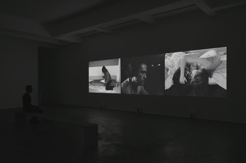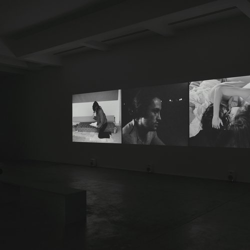 “Je tu il elle” est exposé dans une galerie d’art. Le film dont cette installation est tirée était et peut encore être projeté dans des salles de cinéma. Le verbe « exposer » est donc préféré pour l’installation fixée au mur sous forme de triptyque. « Projeter » éveille l’idée d’un écoulement, d’un défilement, d’un déplacement d’un point à un autre. « Exposer », celle d’une durée stable, d’une certaine mise en révélation, d’un arrêt du temps. Ce sont trois grands écrans, juxtaposés selon un ordre réfléchi, chacun habité de morceaux de cinéma, des images qui bougent, indépendantes et en lien avec leurs voisines. Le dispositif évoque des triptyques de peintures, des retables. Le film « je tu il elle » est la matrice de cette installation. Il date de 1974, en noir et blanc, et illustre les commencements de l’œuvre de Chantal Akerman, son surgissement dans le réel de la vie, dans l’imaginaire des gens qui vont le voir, le regarder, le partager, l’aimer, le détester. Et plus spécifiquement, c’est aussi son surgissement irréversible dans l’histoire du cinéma. Le film a la force des « débuts », des naissances, où l’artiste articule en récit les problématiques qui stimulent son désir de filmer, de raconter, de dévoiler sa manière singulière de regarder le monde, la vie, à travers une syntaxe qui lui est propre. Syntaxe qui surgit là sous forme d’intuitions géniales, « jeunes », éblouissantes, et qu’elle va élaborer et formaliser au fil de ses films. Les deux, problématiques et syntaxe, sont organiquement complices, dialectiques.