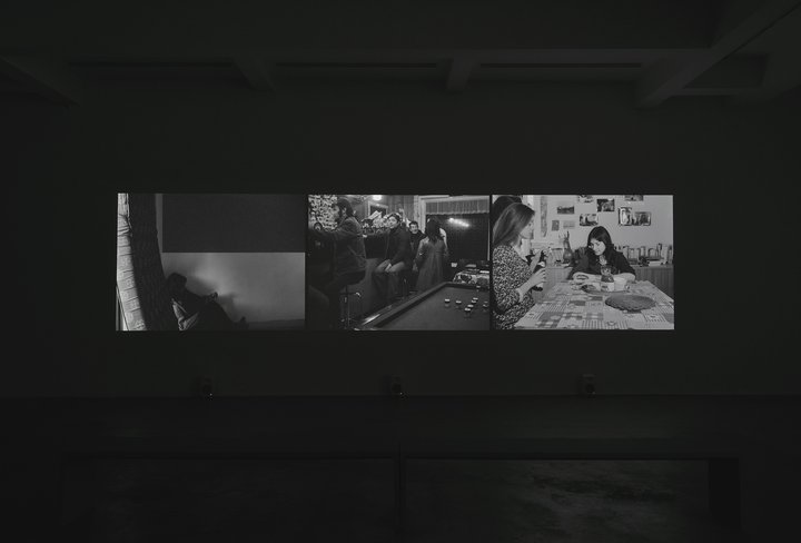 Face à l’installation, le regard papillonne. Il essaie de suivre les trois fils narratifs, simultanément. Mais, fatalement, selon les rythmes propres à chaque scène, il s’absorbera complètement dans l’écran de droite, puis à gauche, puis au centre. Ou d’abord au centre, à gauche, puis à droite. La lecture de gauche à droite est vite désorientée. Les séquences sont en boucle. Cela permet de rentrer au cœur même de la répétition, de vérifier qu’à chaque fois, l’œil ne trace pas les mêmes cheminements entre les trois écrans, il butine autrement, il est capté différemment, il trace d’autres récits possibles ou une pluralité de micro-récits au sein de la narration principale (il est rare, dans une salle de cinéma, de rester pour assister à deux projections continues du même film).