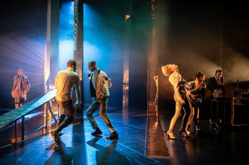 L’action se situe dans un futur proche, pourtant l’esthétique théâtrale fait volontairement un saut en arrière. Revisitant les années 90, aujourd’hui très tendance, la scénographie et les costumes produisent un effet d’ailleurs qui ne se fixe pas dans le temps. Tout en suggestion, sans rien définir, la mise en scène préfère laisser l’accent sur le discours du spectacle. A la fois véranda, boîte de nuit, ville, ou forêt, cette scénographie, toute de métal, en complète verticalité, joue de ses reflets lumineux créant des espaces interchangeables et fantastiques.