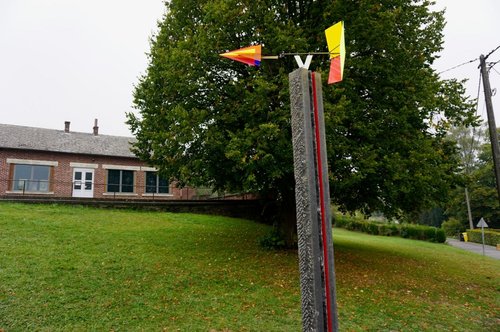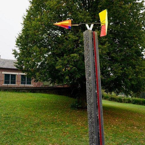 À cette balise historique, répond, entre arbre et école, une colonne coiffée d’un engin parabolique à flèche feuilletée qui capte et condense les lumières et couleurs imperceptibles, éparpillées dans l’atmosphère. Balayant la grisaille ou zébrant l’azur, il évoque le travail inlassable d’un phare, projetant au sol les particules irisées de lumières-couleurs inattendues, restes d’arc-en-ciel. Il tourne sot, jamais au repos, jamais stable, toujours titillé par l’un ou l’autre courant d’air anarchique, du haut de sa pierre levée, trait d’union entre enracinement dans un terroir et désir d’instantané volatil, tournoyant, à l’envers, à l’endroit, souple ou saccadé, brouillant les pistes, imprévisible. Il désorganise les repères spatiaux, invite à habiter l’instabilité lumineuse, la fragilité cosmologique. La pierre bouchardée est striée par deux veines, l’une descendant, l’autre montant, l’une de sève rouge, l’autre de sève verte, couleurs complémentaires.