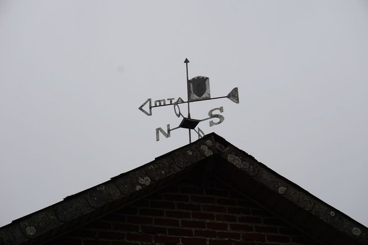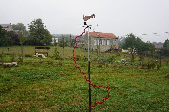 Sur le toit de l’ancienne école, aujourd’hui atelier de gravure du centre culturel, la girouette de l’artisan, par son exécution « ancestrale » et son illustration, le blason du village, rappelle la fonction initiale de cet objet : situer un centre – l’endroit où l’on vit –, poser les repères des quatre points cardinaux – l’ailleurs, l’extérieur – et indiquer d’où vient le vent et où il va. Un sens. À partir de cette invite à décoder le ciel, s’esquisse la lecture des signes qui augurent la météo à venir. Le vent, alors qualifié, avec tout ce qu’il charrie selon ses origines, est ponctué de sentences : « tiens, la pluie devrait arriver », « les nuages vont être vite chassés »…