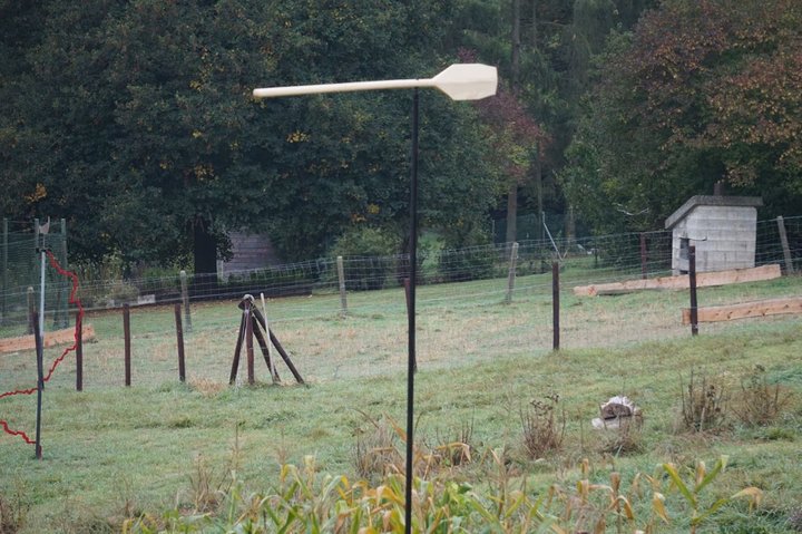 Ensuite, le regard balaie la topographie et distingue, parmi l’herbe, les foins, les branches, la brume, des traits pas toujours bien tranchés. En y regardant à deux fois, ce sont des déclinaisons et mutation de cet objet traditionnel, sculptures-girouettes qui racontent l’évolution de la manière de scruter le ciel, d’essayer d’y lire de quoi demain sera fait. Il y a d’abord un grand trait clair, horizontal. Dépaysée, déboussolée, c’est une pagaie en bois. Elle est sensible et oscille comme un gouvernail dans le vide, un gouvernail du vide. Elle cristallise une symétrie entre les deux éléments, l’air, le vent. Une sorte de ruissellement dans lequel on essaie de tracer un chemin, une existence au cap toujours ardu à tenir. La fragilité nue de l’orientation de soi et des choses s’y module, avec humour incongru. Silencieuse, elle évoque pourtant un sillage sonore, celui d’une flèche fendant le vide ou d’une rame qui brasse la surface d’un fleuve. Elle dit aussi une confusion croissante entre les repères naturels.