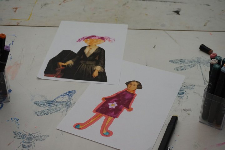 Après une collation, le groupe migre vers les ateliers du CEC, au Château Burbant. Autour d’une grande table, il va s’agir de s’essayer au découpage et collage, à donner forme aux forces encore informelles par où les émotions s’approprient et reformulent ce qu’évoquent les œuvres d’art. Le matériau de base est constitué par des reproductions de peintres anciens, originaires de la région d’Ath. Le matériel est rassemblé sur la table, à partager, les consignes communiquées. Les photocopies sont distribuées. D’abord, découper aux ciseaux les personnages peints. La dextérité des enfants dans le maniement des ciseaux est stupéfiante. Ensuite, couper les têtes, coller tête et corps sur des feuilles blanches différentes. Et dessiner sur chaque feuille le corps et la tête qui manquent. Sans se brider au niveau fantaisie. L’application et l’émulation sont réjouissantes. Ensuite, le processus se complexifie, intègre d’autres niveaux de collage, le premier résultat – personnages coupés-collés et dessinés - accueille un élément prélevé dans des magazines et, pour finir, avec des mots reçus, chaque enfant donne un titre décalé à son œuvre.