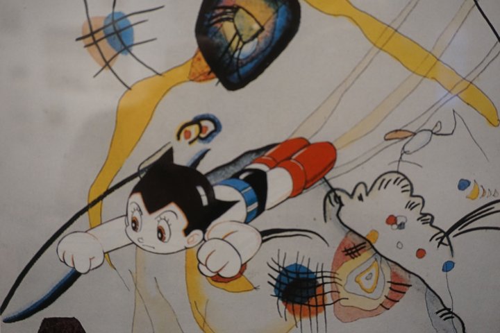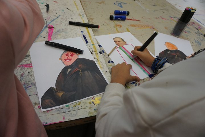Un premier exercice, individuel et collectif, est conduit dans l’exposition. Chaque enfant reçoit la reproduction d’une peinture, doit la retrouver parmi les collages de Liénard, identifier ce qui a été « collé » et raconter ce que cela lui évoque comme histoire. C’est à une passionnante déambulation que l’on assiste, d’œuvre en œuvre, chacun·e présentant sa découverte, petite voix timide, mais déterminée ou débit extraverti, inspiré. Un bel exercice d’interprétation, apprentissage de ce que, face à l’art, l’essentiel est de dire et relier tout ce que cela évoque. Bien entendu, vu le jeune âge, le potentiel de traces et rémanences est encore léger, mais loin d’être inexistant. Ce que sortent les enfants est souvent surprenant et bien des compositions leur parlent. Par exemple cette toile de Kandinsky aux éléments disparates, dont quelques traits internes propulsent Astro Boy vers l’avant, bras et poing tendus, sa force percutant et faisant exploser tous les éléments du décor. Le super héros fait partie de la toile, il y est comme camouflé. La manière dont, dans les aventures qui lui sont propres, il éparpille la structure de l’espace, rencontre l’œil (jadis) nouveau avec lequel Kandinsky compose ses paysages désarticulés, plein d’écarts, de distances. Ailleurs, face à la reproduction du portrait au turban rouge – peut-être autoportrait de Jan van Eyck –, ce qui prédomine est l’indistinction de l’identité de genre. Et l’assurance de se trouver devant un visage sévère, parcheminé, limite embaumé, autant tourné vers l’intérieur que cherchant à imposer son aura sociale alentour. L’intervention de l’artiste, plaçant un soutien-gorge sur le buste du personnage, accentue le trouble de l’identité et permet d’éprouver qu’il n’y peut y avoir d’assignation absolue à tel ou tel genre. Il est normal que certaines frontières, parfois, soient floues. Au passage, sur le ton de la blague, c’est rappeler les vieux trucs qui permettent de déjouer les effets d’autorité.