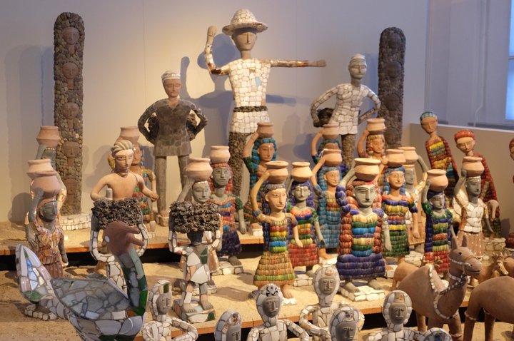 De l’autre côté de la cour, accueillis par une bâche d’un beau dirigeable de Willem Van Genk, nous montons les escaliers (au jour protégé de grilles à hauteur d’homme) pour découvrir les richesses de la Kunstcollectie. Cette très belle collection d’art outsider (non synonymes, mais réalités proches : art brut, art différencié, art en marge, art autodidacte, art hors normes), fort enrichie en 2002 par une collaboration sur la longue durée avec la collection néerlandaise De Stadshof, comporte de très belles pièces des planches peintes de Tim Brown, paysan et artiste du Mississippi, des poupées de Michel Nedjar, un ensemble de plusieurs dizaines de statuettes de Nek Chand (sorte de « facteur Cheval » du Pendjab, ouvrier, collecteur, cycliste et sculpteur sur le chantier de Chandigarh du Corbusier), une maquette de ville dont nous n’avons pas réussi à identifier l’auteur, etc.