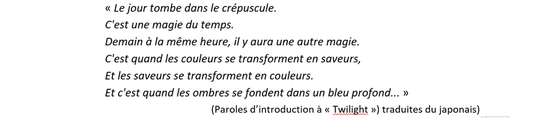 Et quand le soleil s’évanouit lentement, que l’obscurité attend patiemment les feux de la nuit, quand les passants désertent les avenues et que les sirènes se taisent, un air fluide, magique et gracile (« Twilight ») s’élève au son de la harpe, sous réverbe, d’un accompagnement minimaliste et mélancolique.