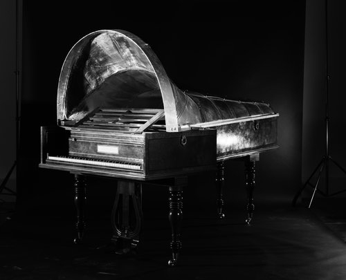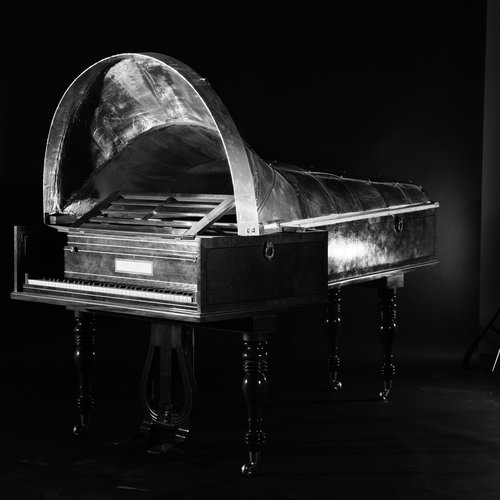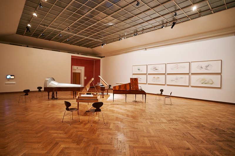 Coup de cœur pour cette salle entièrement vouée à la musique pour piano de Beethoven. Quatre répliques d'instruments sont disposées en étoile. Sur le cordier de chacun d'eux, des hauts-parleurs ont été fixés et diffusent à tour de rôle l'extrait d'une œuvre destinée au type d'instrument sur lequel on l'entend. Car, à cette époque, les révolutions techniques dans le domaine organologique se succèdent rapidement. Une pièce écrite pour le piano Conrad Graf de 1826, dont le clavier compte six octaves et demie et qui a des ressources dynamiques proches de nos pianos modernes, n'aurait pu être jouée sur l'instrument de Johann Andreas Stein de 1786 qui n'avait que cinq octaves et sonnait à peine plus fort qu'un clavecin. Cette chambre atteste de l'attrait de Beethoven pour les innovations de son temps. Au mur, les dessins de Jorinde Voigt, sous la forme de graphiques poétiques, représentent visuellement les pièces jouées sur chacun des claviers.