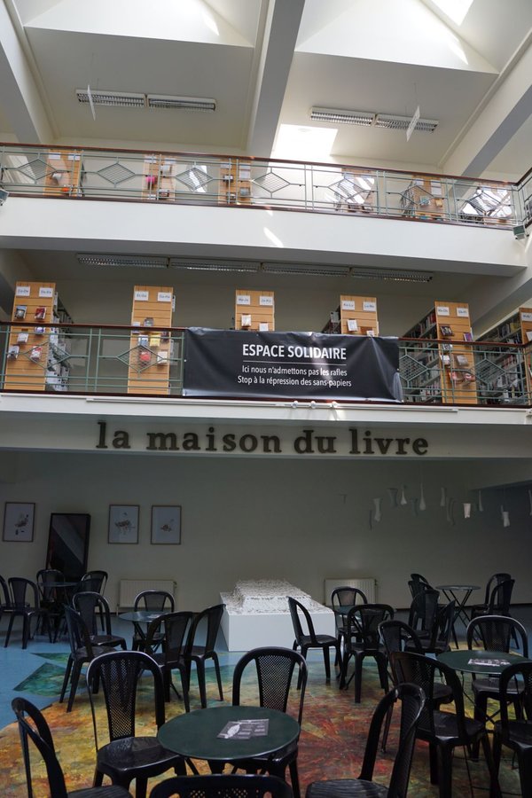 Avant d’imaginer la Maison du Livre et avant d’accepter de porter son projet au grand jour puis d’en prendre la direction, Joëlle Baumerder a eu plusieurs vies. Des vies sans rapport évident avec la littérature, puisque formée au droit et à la criminologie après des études de psychologie, elle a entamé son parcours professionnel dans le milieu carcéral en s’investissant sur la question de la réinsertion. Plus tard, elle a rejoint le service de la culture de Saint-Gilles et de là elle en est venue, il y a vingt ans, à concrétiser son projet de Maison du Livre. Avant cela, elle a encore travaillé pendant dix ans auprès de diverses associations juives, devenant journaliste pour la revue Points Critiques, émanation de l’UPJB (Union des Progressistes Juifs de Belgique), organe pour lequel elle a couvert la première intifada, puis engagée au CCLJ (Centre Communautaire Laïc Juif), missions considérées comme nécessaires par cette petite fille de disparus de la Shoah. Au fil de ses divers emplois, Joëlle a toujours tenu à garder ses distances vis-à-vis des partis politiques préférant exprimer ses engagements par des actes éthiques et citoyens. De passage à la Maison du Livre le lendemain du grand rassemblement devant le Palais de Justice pour la mémoire de Mawda, cette migrante de 2 ans tuée par balle lors d’une course-poursuite avec la police, on aperçoit, suspendue devant une fenêtre, la robe d’une petite fille. Joëlle nous expliquera que, présente à la veillée, elle n’a pu se résoudre à abandonner à une destruction certaine autant que doublement symbolique des centaines de petits vêtements, ultime hommage des manifestants à la défunte.
