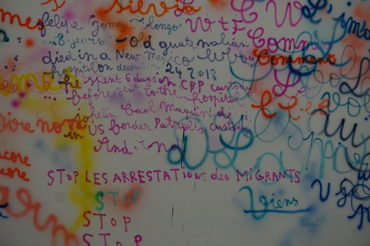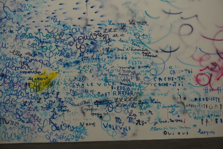 C’est une grande fresque qui submerge. Elle envahit les murs blancs sans atténuer l’impression d’un vide oppressant. Ça commence à gauche, au ras du sol, un vol de poussières floues, de teintes chaleureuses mais dépigmentées, la terre se dérobe. L’empreinte de mains qui marquent leur appartenance à cette terre – juste un passage – cherchent une issue. Le mot « viens » en altitude, détaché, hors sol. Entendre des voix qui disent qu’il y a une solution ailleurs, des humains pour accueillir, partager une autre terre, une foi inconditionnelle – irrationnelle – en l’humanité. L’hospitalité n’est-elle pas en vigueur universellement ? Être poussé à partir. Puis le mot « viens » se rapproche, se répète, se brouille dans une ligne têtue de part et d’autre de l’angle du mur où se produit une forte tension, un cap à franchir. Une rupture prémonitoire. Ça bouillonne, les « e » et les accents circonflexes abondent, s’imbriquent les uns dans les autres, résonnant avec « rêve », « merveille », « poème », « larmes » du départ, le tout superposé, organisé en flux successifs, chaotiques. Rouge, orange, jaune. Puis la rupture, le « se jeter à l’eau » impérieux, parce qu’il n’y a pas d’autres solutions.