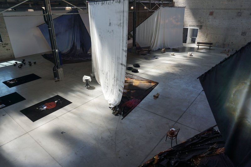 Le paysage de la grande salle restitue l’amplitude de ce manque « photographié » en un instant crucial : peut-être est-ce déjà trop tard, peut-être tout reste-t-il possible. C’est figé, entre effondrement irrémédiable et ultime sursaut. Tout peut encore basculer d’un côté ou de l’autre. On songe en ces temps lointains où la disparition du soleil derrière la ligne d’horizon pouvait être perçue comme définitive. Sur de grandes toiles sont imprimées des photos prises par l’artiste, fragments de ces paysages crépusculaires où il semble que l’instant nous parle à l’oreille, où une fusion avec l’environnement reste possible, évoque une harmonie perdue. Ces images-voiles sont affalées, pleines de plis et de fronces, dégonflées, elles marquent une irrémédiable dissociation entre ce que l’on est et ce que l’on voit, ça ne colle plus, il n’y a plus d’adhérence et, du coup, on ne voit plus que l’envers du décor, un paysage de choses finies, épuisées après usage, paysage de ce qui a eu lieu. Le sol est parsemé de choses-fantômes, on dirait que là, il y a peu de temps, se trouvait un être qui s’est désintégré, ne laissant que quelques effets formant rébus ou constellation métaphorique.