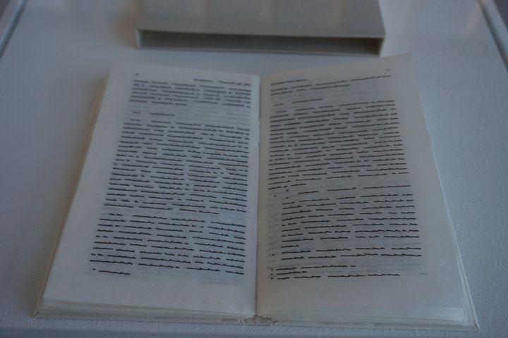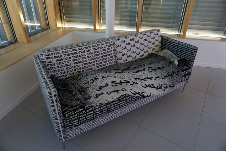 Alors, depuis un tableau où un corps féminin, de dos, posé sur des lignes de textes, évoque une lettre, en un subtil exercice de mimétisme, jusqu’au tableau dont la peinture imite les portées respirantes, fantomatiques d’un texte imprimé effacé, en passant par un livre manuscrit dont les lignes ne sont plus que tracés sismographiques des pulsions calligraphiques, ou un divan qui s’offre comme un mille-feuilles moelleux de mots, de phrases, de locutions où rêver à même les lettres, ce qui traverse le visiteur (la visiteuse) est que tout corps – donc tout ce qui constitue sa vie organique et psychique – est baigné de langage qui façonne les habitudes, les identités, les formes et les styles d’être, les assignations de genre. La langue est partout, tout est langue, tout est jeu de langage, sonore ou graphique.