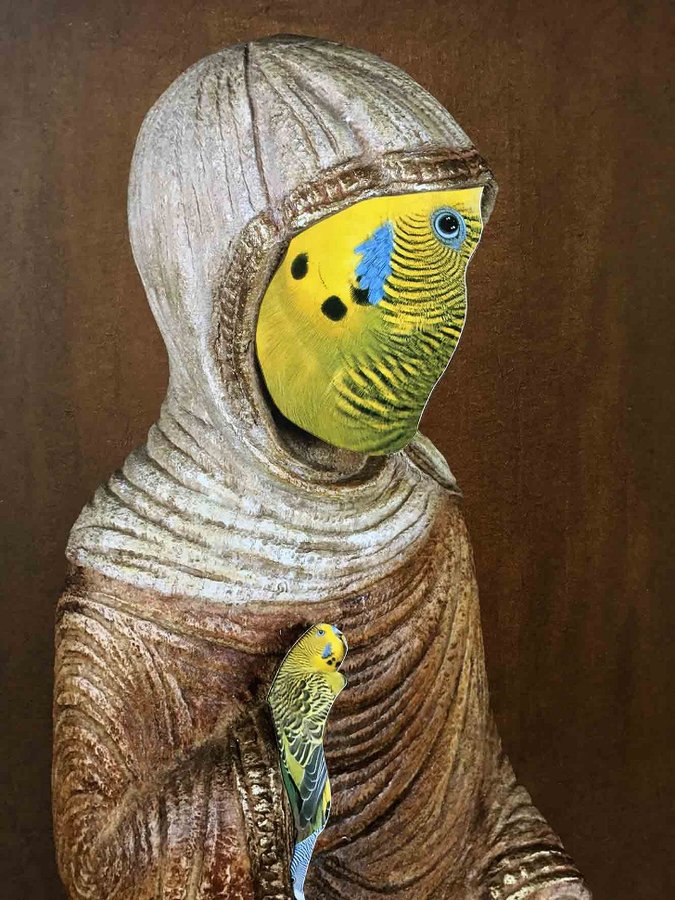 Quand Lahlou, au sein d’une énumération, cite « l’autoportrait » dans la liste des matières qu’il utilise dans son art, cela commence par nous surprendre. Puis on repense à cet enracinement dans l’art de la mise à l’épreuve du corps qu’est la performance (marcher trente kilomètres en talons aiguilles, de Malines à Anvers, ce n’est pas rien) pour nous souvenir que le corps est aussi une matière artistique – y compris dans la déclinaison immobile et reposée d’un visage pensif dont le rapport ambigu entre le masculin et le féminin interroge nos aprioris de genres. Travail sur le visage – mais ici sur les rapports du religieux, du féminin, de l’humain et de l’animal – qu’on retrouve dans une œuvre relativement discrète mais très belle et mystérieuse : « Of the Conference of Birds » (2017). S’inspirant de La Conférence des oiseaux, une épopée persane soufie du XIIe siècle, cette série de collages fait se rencontrer les visages en creux, en découpes, de vierges chrétiennes en bois et le chatoyant plumage d’oiseaux qui leur greffent de fascinants nouveaux traits.