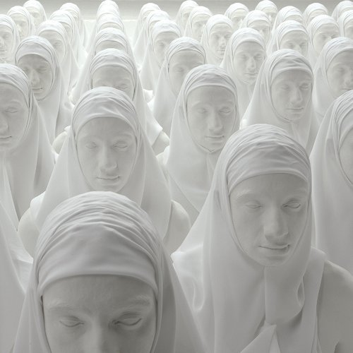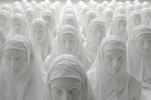 Dans une époque dont le paysage mental est emberlificoté dans un écheveau de peurs, de projections, d’amalgames, de demi-vérités et de purs fantasmes sur les rapports de l’Occident et du monde musulman, une œuvre comme « 72 vierges » (2012) (cf. l’image principale de cet article, ci-dessus) qui fait évidemment référence à la récompense promise aux martyrs musulmans – et qui propose une sorte d’armée de l’Empereur Qin mais en version réduite et en plâtre, démultipliant le buste et le visage voilé d’un hijab de Mehdi-Georges Lahlou lui-même – ouvre la porte à de multiples incompréhensions et interprétations hâtives. Ce qui sauve Lahlou de « l’effet Benetton » et du « syndrome Toscani » (l’utilisation très mercantile par le publicitaire italien de ressorts faciles entre une image-choc et un sujet de société à vif – le Sida, le racisme, les religions, la guerre, etc.) c’est la subtilité, la finesse et le dépassement de toutes les premières images trop lisibles ou faussement évidentes. Par la juxtaposition réfléchie, la reprise de motifs, les échos entre les œuvres, la diffraction, le jeu sur les fausses pistes et les doubles lectures, le jeune artiste crée un espace de questionnement précieux pour le spectateur qui s’offre le temps de s’y arrêter un moment. Un jardin pour l’esprit ?