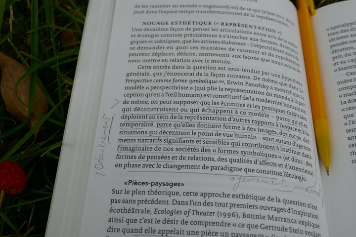 Julie Sermon présente l’appareil critique qui l’a aidée dans ses investigations, retraçant notamment l’historique du mouvement « écocritique », produisant analyse, critique et mises en perspective. Dans ce mouvement, elle égrène une riche et judicieuse bibliographie pour nous documenter par nous-mêmes, aller plus loin. Elle pose la question de savoir si le théâtre, « prioritairement centré sur les actions et les histoires humaines », est en phase avec le fait de « s’inscrire dans la grande mutation de valeurs inhérente à la pensée écologique, à savoir : remettre en cause l’anthropocentrisme, attirer l’attention sur (et inviter à développer de nouvelles relations avec) le "monde-plus-qu’humain" ». (p.46)