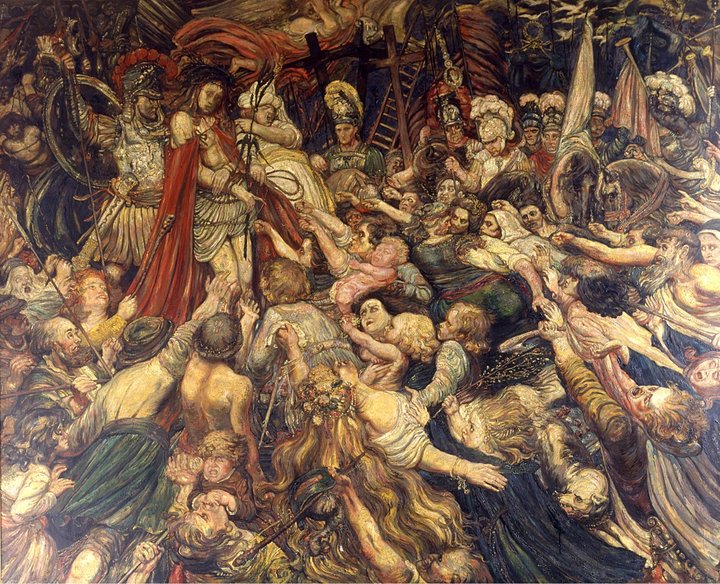 L’enfer sur terre, il nous y plonge par contre sans intermédiaire, quand il s’agit de rendre compte des réalités des champs de bataille, des champs de carnage, des catastrophes industrielles. Ce sont les visions des tranchées, avec l’attente torturante de l’assaut, dans le noir et l’incertitude, à l’écoute comme une bête dans son trou, ou l’exubérance hystérique des corps massacrés, de la tranchée prise sur l’ennemi. Ce sont les barricades et l’ivresse de batailler et tuer pour restaurer un monde plus juste (inspiré par la Commune ?). Mais aussi les corps sacrifiés par la modernité sans vergogne des nouvelles grandes industries minières, lors de la catastrophe de Courrières (1906, 1099 morts). S’il adhère au dégoût anarchique pour ces évolutions sociales et capitalistes, de Groux ne milite pas, ce n’est pas à proprement parler un peintre social. Du reste, l’atmosphère est toute autre quand il représente les frasques napoléoniennes, victoire ou défaites grandioses, Waterloo et les chevaux de l’Apocalypse, les cieux rougeoyant et la charge des Walkyries, préférant célébrer une sorte de transcendance du grand homme qui survivra à tous ses charniers, à voir comme autant d’occasions manquées.