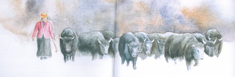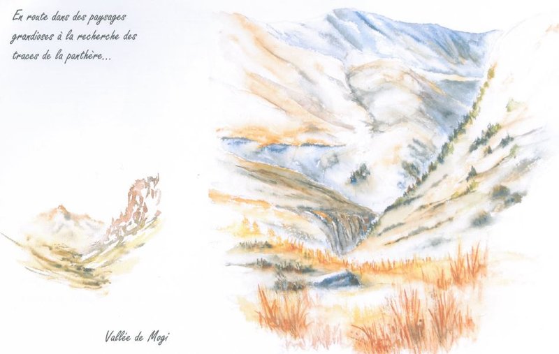 Voilà donc les photographes, romancier et dessinateur partis à l’assaut de la montagne. Dès les premiers cols franchis, Fagniart sort ses crayons, cartons et couleurs. Le félin est encore loin et hypothétique, l’aquarelliste s’attache donc à croquer les yacks et leurs propriétaires, les moines croisés en chemin, les édifices bouddhistes (les Chörten) et autres moulins à prières. Sans oublier les drapeaux colorés qui barrent les vallées de leurs longs cordons et soufflent vers les dieux et les passants leurs messages sacrés. L’aquarelliste se régale : bleu des glaciers, blanc des torrents, brun de la caillasse et, surtout, rouge des vêtements et des attelages, la couleur fétiche des Tibétains, car elle apporte chance et prospérité dans les foyers. « J’ai voulu fixer les moments d’émerveillements, où l’œil s’arrête pour capter le moment présent », commente notre compatriote (4).