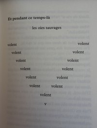 La subtilité du livre apparaît plus encore dans l’articulation des chapitres. Entre les témoignages viennent en effet s’insérer des espaces de transition qui, sous leurs airs joueurs et légers, proposent un contenu graphique qui s’installe en contrepoint des sources orales. Ce sont de courts interludes qui prennent la forme de calligrammes (Et pendant ce temps-là les oies sauvages volent volent volent…), d’une dictée (De Bertolt Brecht comme ça se prononce), et d’exercices d’école : traduction, rédaction, logique, philosophie, mathématique, histoire. En préambule, le glossaire avec sa suite inepte d’acronymes (de ADA à ZAPI) se donne presque comme une blague. Ce qui ressort d’entre ces lignes est d’un comique à pleurer : c’est la dimension absurde de cette crise fabriquée de toutes pièces par des machines d’État. De l’argent jeté par les fenêtres, du temps gaspillé, des dépenses inutiles – des vies mutilées pour… des papiers et encore des papiers et encore des papiers pour faire des papiers, ou refuser de faire des papiers, et ainsi de suite. (p. 201).