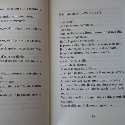 De ce côté-là du livre, la démarche de Violaine Schwartz rappelle celle de l’écrivaine russe Svetlana Alexievitch (Prix Nobel de littérature en 2015). Dans une telle entreprise, la fiction n’est pas le fait d’un traitement littéraire. C’est plutôt le fait d’un système juridique défaillant de nature à produire du mensonge organisé. Le récit de vie est un objet problématique, fruit dénaturé d’un système problématique. Demandé, redemandé et encore redemandé, questionné, mis en doute, retranscrit, classé, affublé d’un numéro à 13 chiffres sinon davantage, validé ou invalidé, le discours subit fatalement des transformations et finit par se muer en légende.