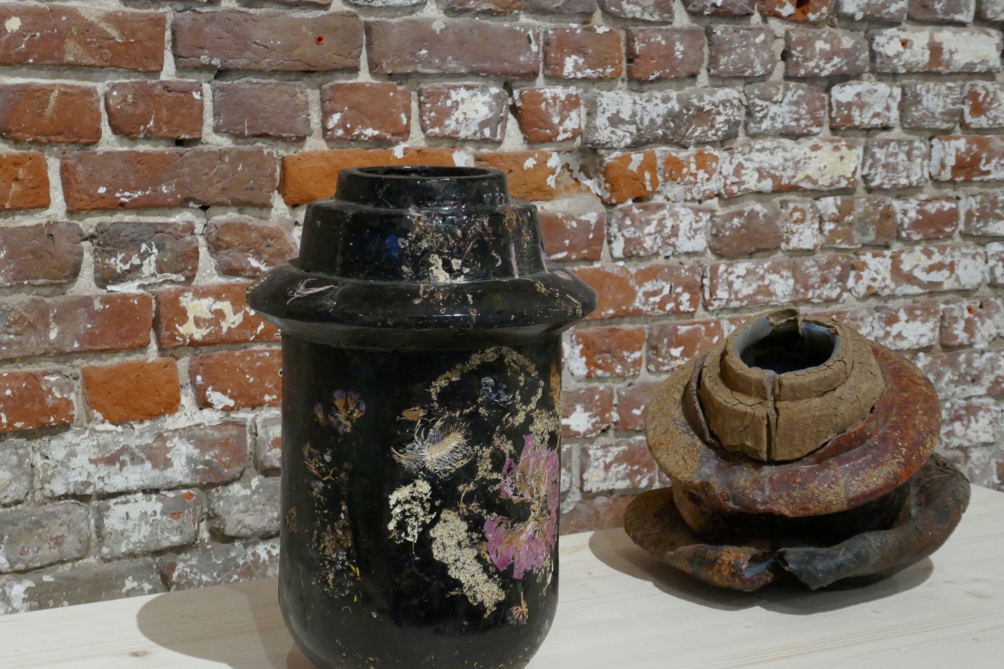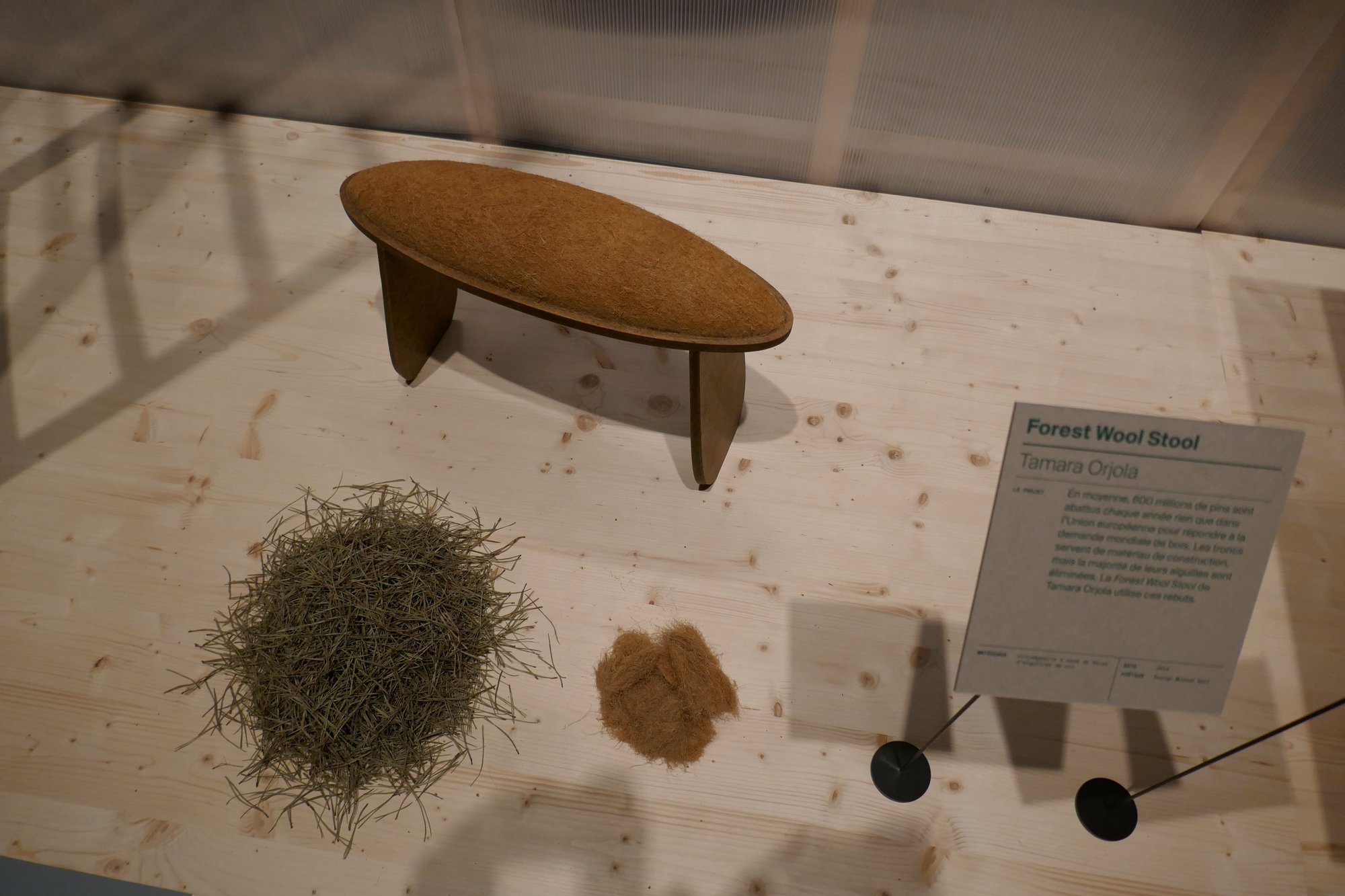 Des exemples concrets sont exposés, des prototypes, des fiches techniques. Ce n’est pas du vent ni des chimères, c’est exposé là. Des formes et des textures sensibles qui ne sont pas simplement des choses pouvant faire l’objet d’échanges marchands, être achetées. Chaque pièce est aussi un outil de connaissance, un fragment de récit, l’organe d’un processus comme toujours en cours, une amorce de solidarité réinventée avec « la fragilité et le caractère éphémère des choses vivantes réelles ». Des baskets sans aucun produit synthétique, entièrement végétales et compostables. Des chaussures en chanvre. Des vases périssables en « aggloméré » réalisé à partir de fleurs fanées. Des tissus matelassés à partir de romarin, sauge et camomille. Des écorces de pins, rebuts de scieries, transformées en « matière noble » proche du cuir. Des écailles d’artichaut et des huiles de fritures récupérées pour confectionner des chaises. L’ingéniosité semble infinie. Et chaque fois que l’on se plonge dans le processus conduisant à ces inventions, on entrevoit, par le contact avec ces choses plus « respirantes » que nos actuels objets industriels, une autre relation à la vie, à la mort.