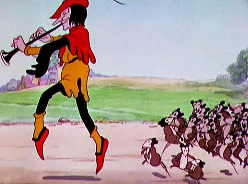 Un étranger est arrivé un beau soir/De son pipeau, il tirait des sons bizarres/Ses cheveux longs lui donnaient l’air d’un vagabond/En ce temps-là, la ville était envahie/Par tous les rats venus du fonds du pays/Privés de pain, les habitants mouraient de faim.