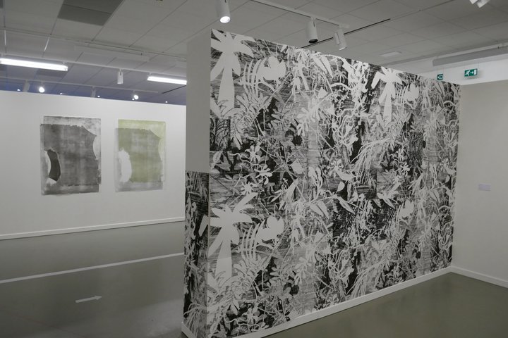 De ces déplacements délicats découlent des désirs de proliférations plus accidentées et fusionnelles. Ainsi des mêlées saturées de lignes et cicatrices erratiques, monotypes d’Alexis Sontag, corps à corps instinctif avec l’avenir bouché, hachuré, cherchant la sortie du chaos au cœur même de celui-ci, en se l’appropriant. Aussi, ce merveilleux « fond marin » bienveillant de Camille Vanderveken, peluches, coutures, sérigraphie sur tissu : « La personnalité et le talent de société des algues vertes », un vrai poème en relief. La même réalise un formidable livre-objet où, éparpillés, au centre pivot du monde, dans l’hélice d’entrailles-racines en 3D, des couples attendent, simplement là, pour l’éternité. Et puis, prolifération par excellence, il y a les « papiers peints » du lauréat Paul de Toytot. On dirait une couche épaisse de végétaux, des siècles de superposition de feuilles, de fleurs, de rameaux, de rhizomes, du plus décomposé au plus stylisé, du plus organique au plus fossile, du plus brut au plus sophistiqué. Leur présence forte, formant communauté et groupe d’individus singuliers, oscille entre violente apparition et soudaine disparition. Un mur de lamentations des plantes dédié aux humains.