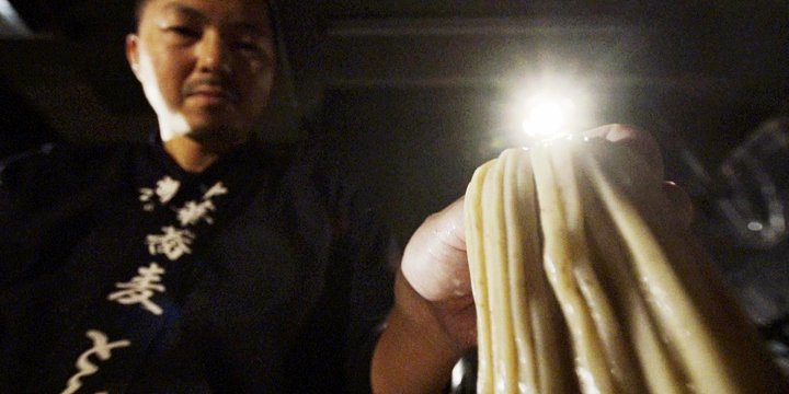 Autre ingrédient primordial d’un bol de ramen : les nouilles. Elles doivent posséder la juste élasticité et la bonne longueur. Osamu Tomita les fabrique lui-même, à la main, utilisant des farines de blé qu’il change selon les saisons. Une scène le voit étirer une nouille presque à l’infini pour montrer sa résistance. Elles doivent également posséder une certaine alcalinité qui leur donne leur couleur jaunâtre mais leur permet également de résister à la chaleur du bouillon et de ne pas se décomposer. Elles sont cuites pendant un temps précis, calculé à la seconde près, puis rincées et refroidies pour capturer les saveurs, selon un procédé également utilisé pour les nouilles udon et soba.