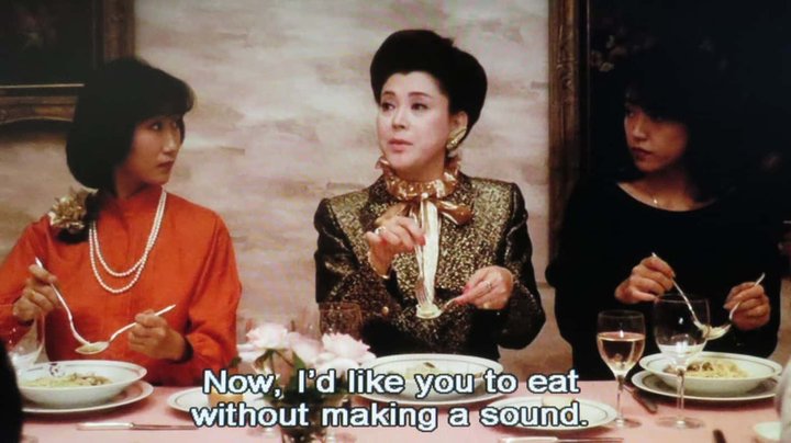 Les soupes de nouilles, au Japon, ça se mange en faisant du bruit. Si le mangeur ne montre pas sa satisfaction en aspirant bruyamment les nouilles, le chef pensera que son plat n’est pas bon. C’est un exercice compliqué pour un Occidental à qui on a appris à manger sans émettre le moindre son. Une scène d’anthologie dans Tampopo illustre cela avec une belle dose d’humour : dans un restaurant chic, un groupe de jeunes filles de la bonne société apprend à manger des spaghettis à l’européenne, en tournant les pâtes autour d’une fourchette et en avalant le tout en une fois, silencieusement. À une autre table est assis un Occidental qui mange son spaghetti à la japonaise, en aspirant bruyamment les pâtes. Les jeunes filles prennent vite exemple sur lui, niant les conseils de bienséance de leur professeur.