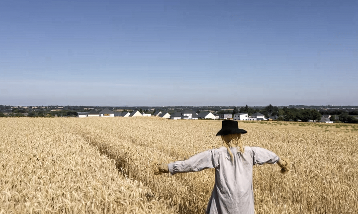 Un épouvantail qui semble résister au temps regarde le paysage évoluer, être transformé. Il voit la disparation des haies du bocage au profit de lignes droites et stériles qui remplacent les zones d’ombre buissonnantes et les cours d’eau sinueux. Il est le témoin de la destruction de cet écosystème riche bien que non naturel, héritage de l’histoire d’un bout de Mayenne en France qui commence il y a 100 ans.