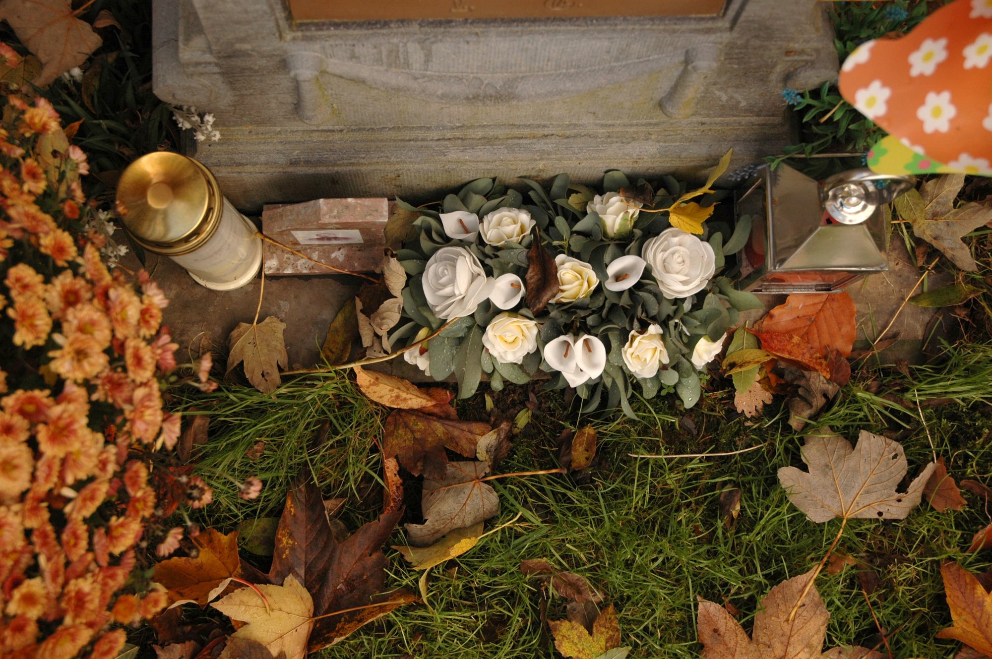 Au fil des saisons, la tombe du mystérieux soldat est la seule qui ne cesse d’être fleurie par sa famille. Elle rend le cimetière plus vivant, le scelle de la trace d’un passage. C’est un rituel qui convoque une fois de plus l’idée de combler le vide. Une bougie, des fleurs, le portrait du jeune soldat à gauche, plaqué sur le marbre, tous ces éléments, sortes d’offrandes au défunt, viennent le commémorer. L’autel funéraire devient une appropriation d’un espace public, un monument privé dans un lieu qui s’efforce d’être dépersonnalisé au profit de la collectivité.